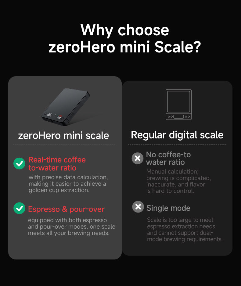 Компактные, точные и готовые к работе в любых условиях — ZEROHERO Mini Scale созданы для тех, кто хочет контролировать каждый грамм кофе и воды, дома, в кофейне или в поездке.