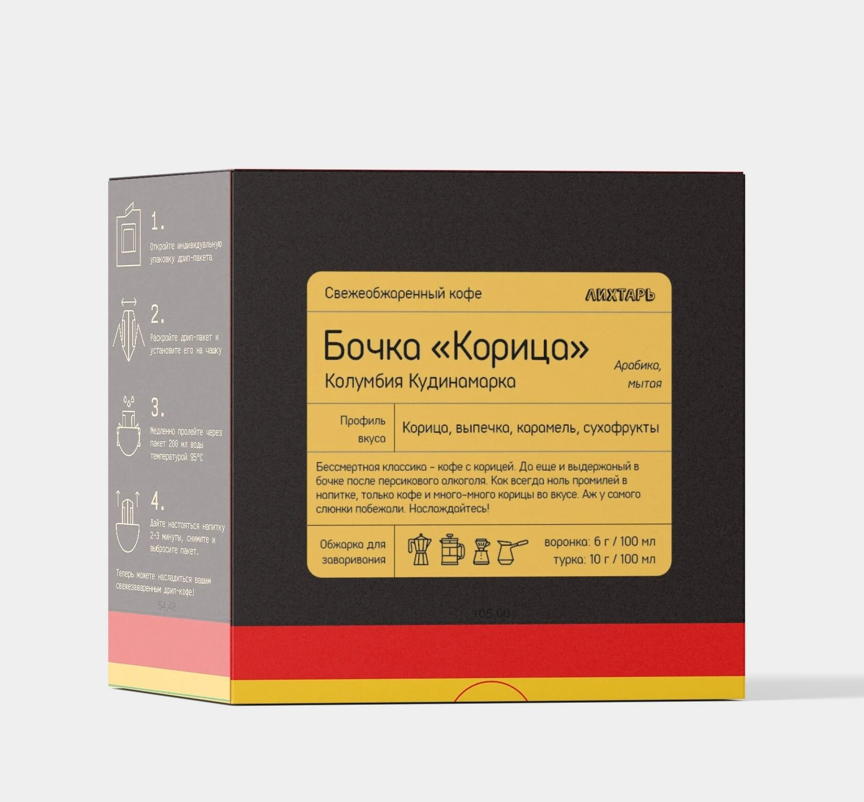 - Вкус: кофе с корицей, выдержанный в бочке после персикового алкоголя