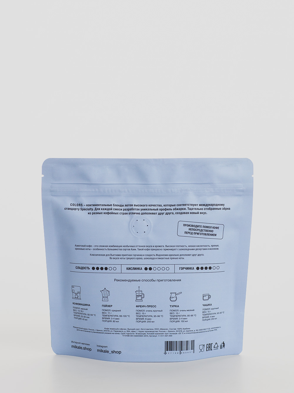 "Чтобы в полной мере раскрыть потенциал Азиатского Бленда Mikale™ COLORS, рекомендую использовать свежемолотые зерна. Попробуйте поэкспериментировать с помолом: более крупный помол раскроет ореховые ноты, а более мелкий – шоколадные. И не бойтесь добавлять специи – щепотка корицы или кардамона только подчеркнет восточный характер этого кофе!"