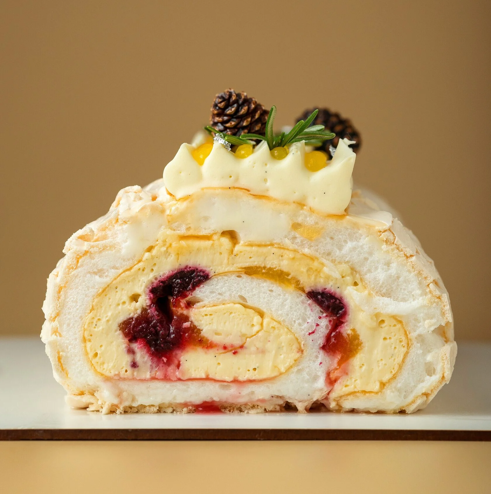 Рулет из воздушной меренги с кремом на основе заварного крема и ванильного взбитого ганаша с маскарпоне. Внутри прослойка из мандарина и черной смородины. Украшен ванильным ганашом с маскарпоне, мандариновым и черносмородиновым конфи, розмарином и цукатами сосновых шишек.
