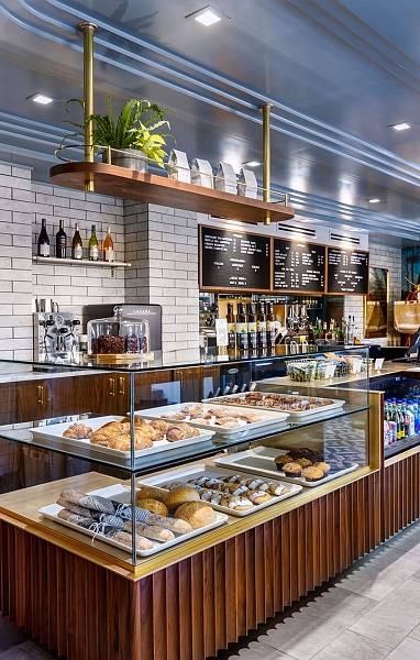 В кофейне можно выделить несколько зон выкладки: витрина для десертов (торты, пирожные – обычно охлаждаемая), витрина для выпечки (круассаны, слойки – обычно нейтральная или с минимальным охлаждением), витрина/холодильник для сэндвичей и салатов (если предусмотрены сытные перекусы, их держат в холодильнике +2…+5 °C во избежание порчи ингредиентов), а также витрина для напитков.