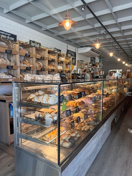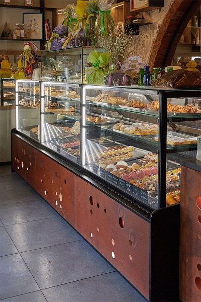 - Неохлаждаемые (нейтральные) витрины – витрины без активного охлаждения, фактически при комнатной температуре. Применяются для продуктов, не требующих холода: хлебобулочной выпечки (булочки, круассаны, печенье), некоторых видов слоек, кондитерских изделий без крема. В них товары сохраняются при температуре окружающей среды. Нейтральные витрины могут быть закрытыми (остеклёнными) – чтобы предотвратить заветривание и обеспечить гигиеничность, – либо открытыми прилавками для самообслуживания. Часто в кофейнях нейтральная витринка используется для свежей выпечки, которая не успеет зачерстветь за день продажи. Например, маффины, печенья, круассаны можно эффектно разложить на открытом прилавке или под стеклом без охлаждения.