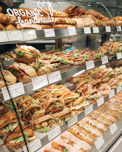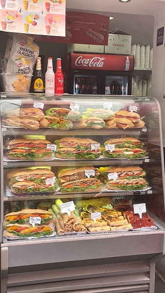 Сэндвичи и салаты, если они готовы заранее, хранят в холодильной витрине, часто на отдельной полке. Бывают особые витрины для сэндвичей – фактически охлаждаемые прилавки с температурой +5…+10 °C и удобной выкладкой бутербродов. Но в небольших кофейнях сэндвичи обычно помещают на ту же охлаждаемую полку, что и торты (отдельно от сладкого) или держат в кухонном холодильнике и выкладывают поштучно под стекло.