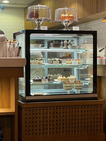Сохранение свежести и качества продуктов. Витрина позволяет хранить десерты при надлежащей температуре и влажности, продлевая срок их реализации. Кремовые и сырные торты не испортятся за день при +4 °C, слойки не затвердеют, шоколад не растает. Защита от внешней среды предотвращает обветривание, высыхание и обсеменение бактериями из воздуха. Так, в отапливаемом помещении без витрины влажность может упасть до 20%, что за пару часов высушит многие скоропортящиеся продукты. В закрытой увлажнённой витрине потери веса и усушки снижаются в разы. Это значит меньше списаний и выброса несвежего товара. Кроме того, соблюдение санитарных норм предписывает хранить скоропортящиеся кондитерские изделия при температуре не выше +6 °C – витрина помогает выполнять эти требования. Тем самым витрина – залог безопасности еды для гостей.Выполнение требований мерчандайзинга. Витрина является «сценой» для продукции, позволяя эффектно презентовать десерты. Грамотно оформленная выкладка под стеклом привлекает внимание гораздо сильнее, чем перечисление позиций в меню. Как говорят маркетологи, «покупатель выбирает глазами» – и это особенно верно для сладостей. Яркие торты, аккуратные пирожные, румяная выпечка, выставленные на разных уровнях и подсвеченные теплым светом, вызывают аппетит и желание купить. Визуальный мерчандайзинг через витрину способен увеличить продажи десертов значительнее, чем любая реклама. Например, эксперты отмечают, что красиво оформленная кондитерская витрина может генерировать до 50% выручки кофейни (в зависимости от концепции) за счет импульсных покупок и привлечения новых гостей. По словам владельца одной московской кофейни, выпечка с витрины приносит в среднем 17–20% месячной выручки его заведения. А в семейных кафе Ribambelle отмечают, что наличие витрины ощутимо увеличивает продажи: и дети, и взрослые, проходя мимо аппетитных экспонатов, редко могут удержаться от покупки. Таким образом, витрина – это еще и инструмент маркетинга и продаж, стимулирующий гостя совершить дополнительный заказ.