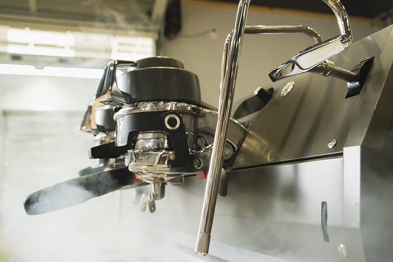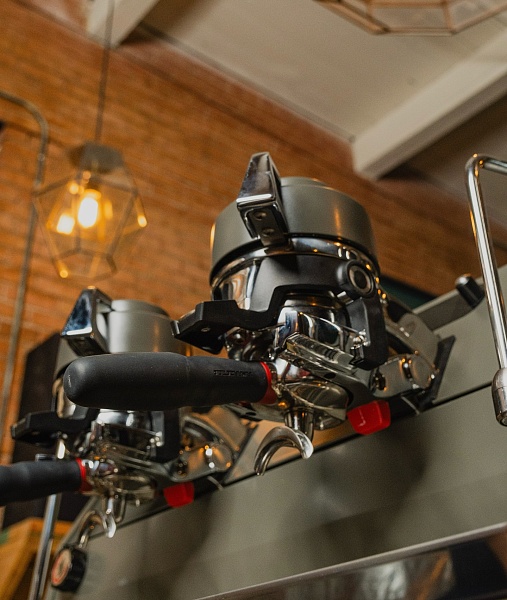 - Закладывание фильтра: бариста помалывает кофе, трамбует и помещает портфильтр в группу. Прямой механизм фиксирует его одним движением, экономя время.