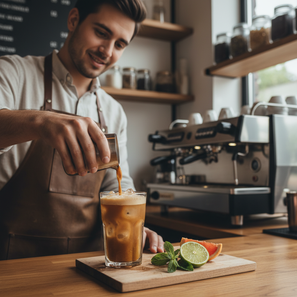 - Вкус и подача: баланс кофе-базиса с освежающим цитрусовым аккордом; подача напоминает освежающий коктейль, но в кофейной атмосфере.